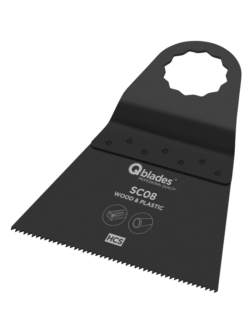 De Qblades SC08 heeft geschrankte vertanding, voor alle werkzaamheden met hout, gipskarton en kunststof. Eenvoudige insnijding in materiaal op elke willekeurige plaats.
